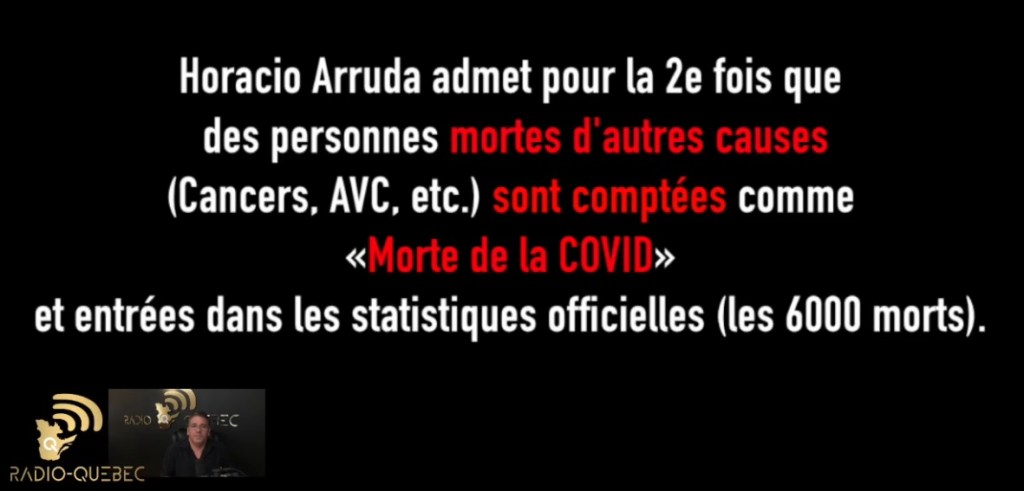 Dans la continuité, voici aussi une conférence de presse de la CPAC (Chaîne d’affaires publiques par câble) du 29 octobre ou je vous invite à aller directement à la minute 50 pour écouter (en VO) ce que monsieur Horacio Arruda (biographie ICI) affirme au sujet de l’enregistrement des personnes mortes d’autres causes (cancers, AVC, etc.): ces personnes sont comptées comme mortes du COVID!!