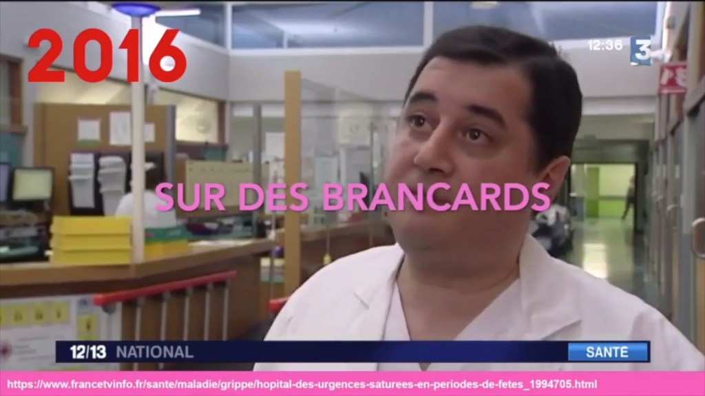 Je vous mets aussi quelques captures d’écran tirés de l’excellente vidéo de Silvano Trotta « Ils osent tout!!!! » (que je vous engage vivement à visionner) qui montrent -entre autres- que les hôpitaux sont saturés, au moins depuis 2015! Et pas seulement depuis l’apparition du Covid…. ( minutes: 31’30 » de la vidéo sus mentionnée).