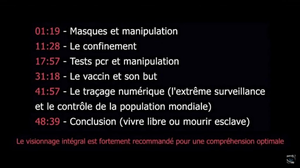 Je vous propose une vidéo à regarder absolument et à diffuser très largement. Celle-ci s’intitule « MANIGANCE-19: La vidéo qui dénonce toute la vérité« . Dans cette vidéo vous découvrirez je cite, « les mensonges et les vérités sur le COVID-19, le cauchemar que les gouvernements prévoient, ainsi que notre dernière chance pour la survie de nos droits et libertés ».