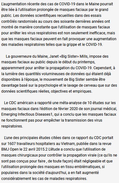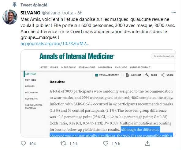 Je vous mets également les liens (sources disponibles sur le tweet de Silvano Trotta – voir aussi vidéos ci-dessus) concernant les études récentes réalisées pour évaluer « l’utilité » des masques; apparemment ces derniers favorisaient les maladies respiratoires: BAS LES MASQUES:!