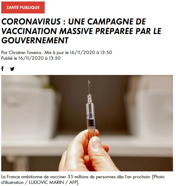 l’article ci-dessous et vidéo associée disponible ici: https://www.cnews.fr/france/2020-11-16/coronavirus-une-campagne-de-vaccination-massive-preparee-par-le-gouvernement
