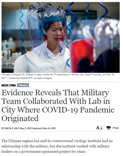 Cependant, Shi a nié que le WIV se soit engagé dans des recherches avec l’armée chinoise. «Je ne connais aucun travail militaire au WIV. Cette information est incorrecte », a déclaré Shi lors d’un webinaire public le 23 mars. Shi n’a pas mentionné que le WIV avait été utilisé par une équipe médicale militaire chinoise au début de 2020 pour développer des vaccins COVID-19.